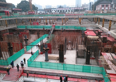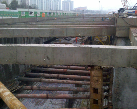 杭州地鐵一號(hào)線武林廣場(chǎng)站是地鐵1號(hào)線與3號(hào)線換乘站,車站為4柱5跨三層結(jié)構(gòu),長(zhǎng)161m,埋深28m,施工工藝為蓋挖逆做法施工,其基坑圍護(hù)結(jié)構(gòu)是地下連續(xù)墻,并與主體結(jié)構(gòu)的側(cè)墻組成疊合墻作為永久結(jié)構(gòu)的墻體。工程技術(shù)人員成功開(kāi)發(fā)應(yīng)用了“超寬超深地下連續(xù)墻施工工法”和“蓋挖地鐵車站液壓垂直插入鋼管柱施工工法”,取得了很好效果。