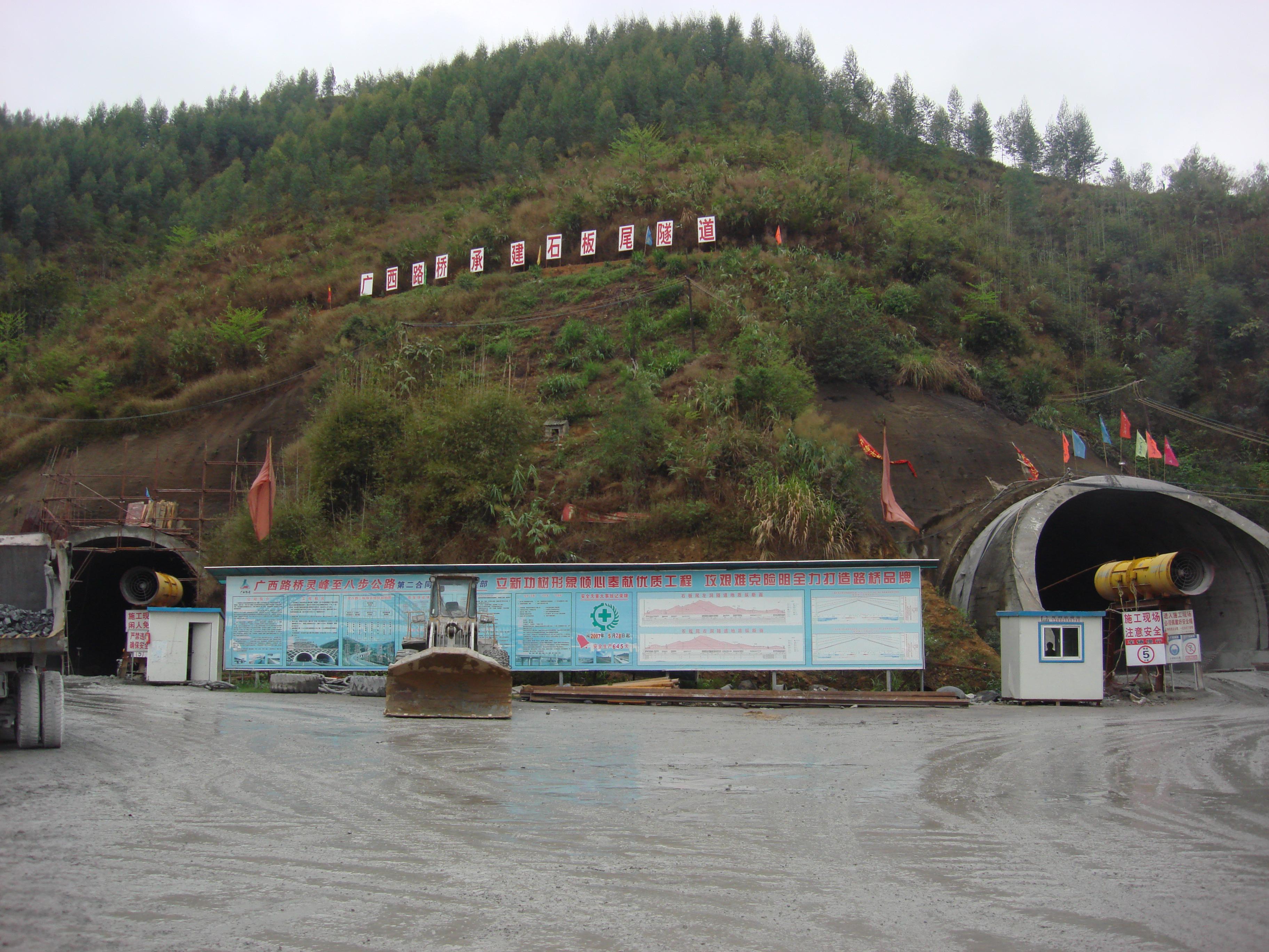 本工程路線起于廣西六寨,終止于廣西河池,接在建的桂梧高速公路賀州支線終點(diǎn),路線全長(zhǎng)76.427公里。路線全線位于賀州境內(nèi),經(jīng)過(guò)的主要鄉(xiāng)鎮(zhèn)有靈峰鎮(zhèn)、信都鎮(zhèn)、大桂山林場(chǎng)、步頭鎮(zhèn)、蓮塘鎮(zhèn)和沙田鎮(zhèn)。主線全線采用雙向四車道高速公路標(biāo)準(zhǔn),設(shè)計(jì)速度100kN/h,路基寬度26.0m,橋涵設(shè)計(jì)汽車荷載采用公路-Ⅰ級(jí)。本項(xiàng)目共有隧道四座,分別為花墳洞隧道(362m、連拱、土建一標(biāo)施工段內(nèi))、石板尾隧道(左線3180、右線3175m、分離式、土建二標(biāo)施工段內(nèi))、大桂山隧道(左線1860m、右線1680m、分離式、土建四標(biāo)施工段內(nèi))、湴田隧道(430m、連拱、土建五標(biāo)施工段內(nèi))。區(qū)間隧道采用礦山法施工,洞身襯砌按新奧法設(shè)計(jì),采用柔性支護(hù)體系結(jié)構(gòu)的復(fù)合式襯砌。