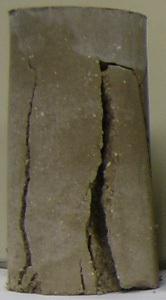 在素土中加入纖維和水泥都能起到提高強(qiáng)度的目的,且提高幅度基本處于同一水平(175-200%),其中素土的強(qiáng)度為0.16MPa,纖維土和水泥土的強(qiáng)度分別為0.44和0.48MPa。但素土、纖維土和水泥土的破壞特征各不相同:素土表現(xiàn)為應(yīng)變軟化的塑性破壞;水泥土表現(xiàn)為完全的脆性破壞,土體強(qiáng)度瞬間喪失,形成的破壞裂隙寬大,相互貫通(圖2(a));纖維土則表現(xiàn)為應(yīng)變硬化的塑性破壞,破壞后土樣中發(fā)育的裂隙相對比較細(xì)小,呈現(xiàn)裂而不斷的特征(圖2(b)),這對工程結(jié)構(gòu)的穩(wěn)定性有重要意義。此外,當(dāng)在纖維土中再加入水泥后,強(qiáng)度得到成倍增加,達(dá)到1.18MPa,遠(yuǎn)遠(yuǎn)超過單純的纖維土和水泥土強(qiáng)度之和,說明二者配合使用增強(qiáng)效果更佳,能極大減少材料用量,節(jié)約工程成本。